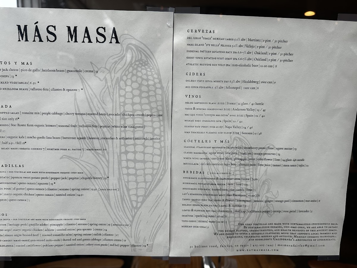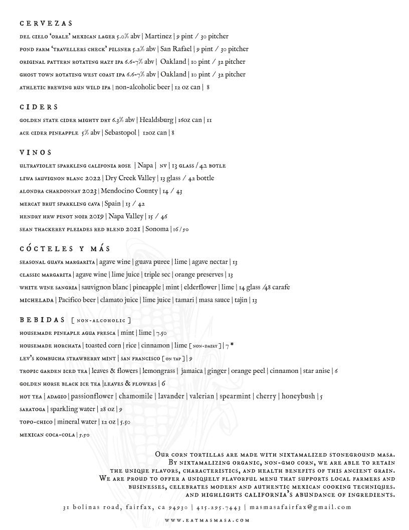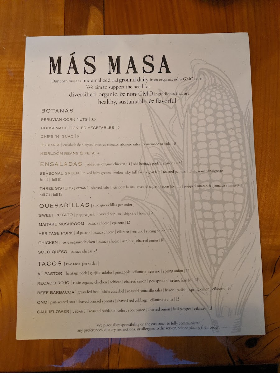 Additional menu highlights include a range of tacos including Al Pastor and fish tacos, housemade hot sauces, chips with guacamole, and other classic Mexican accompaniments like pozole, ceviche, elote, and Peruvian corn nuts.