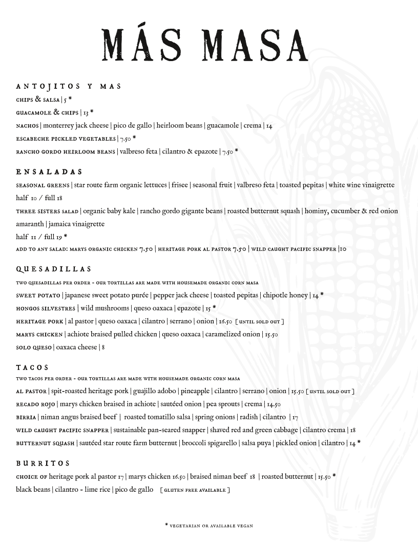The menu features a diverse selection of Mexican dishes, organized into several main groups to accommodate various dining preferences. Visitors can explore fresh salads such as the Seasonal Greens and the Three Sisters, which combine organic and seasonal ingredients with distinct dressings.